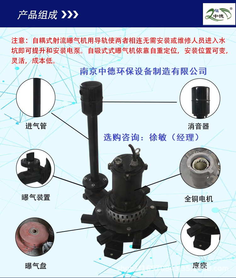 1、结构紧凑,占地面积小,安装方便。除吸气口外,其余机体沉入水中运行,无噪音。进气管出水面可加装消音器,增强消音效果