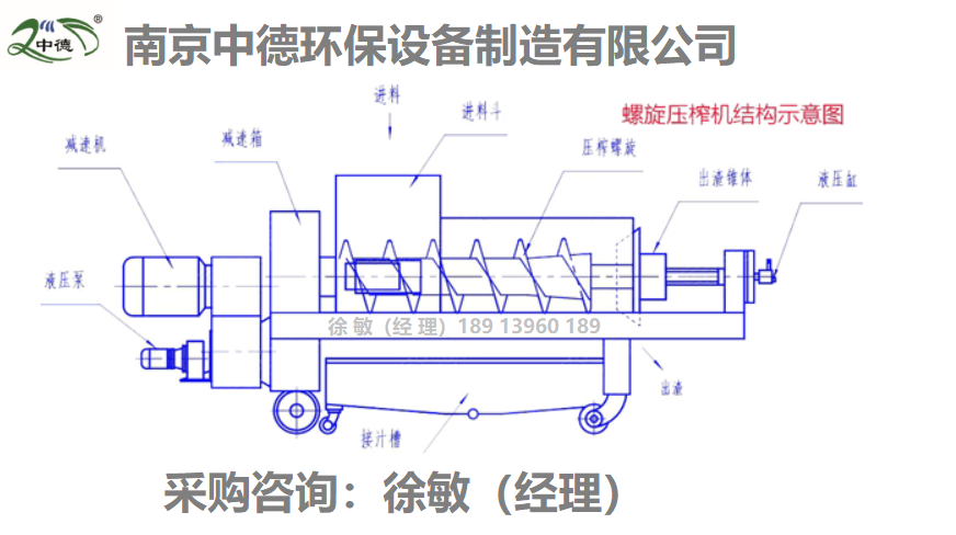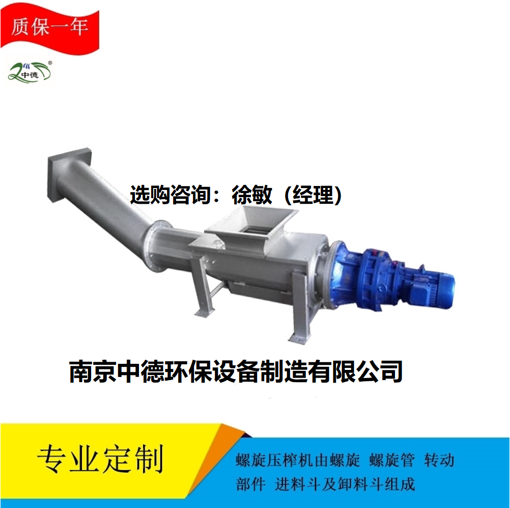 螺旋压榨机由挤压螺旋、螺旋管、传动部件、进料斗及卸料斗等组成。污物由进料斗进入螺旋管,在挤压螺旋的作用下,压缩、脱水后输送至出渣口。