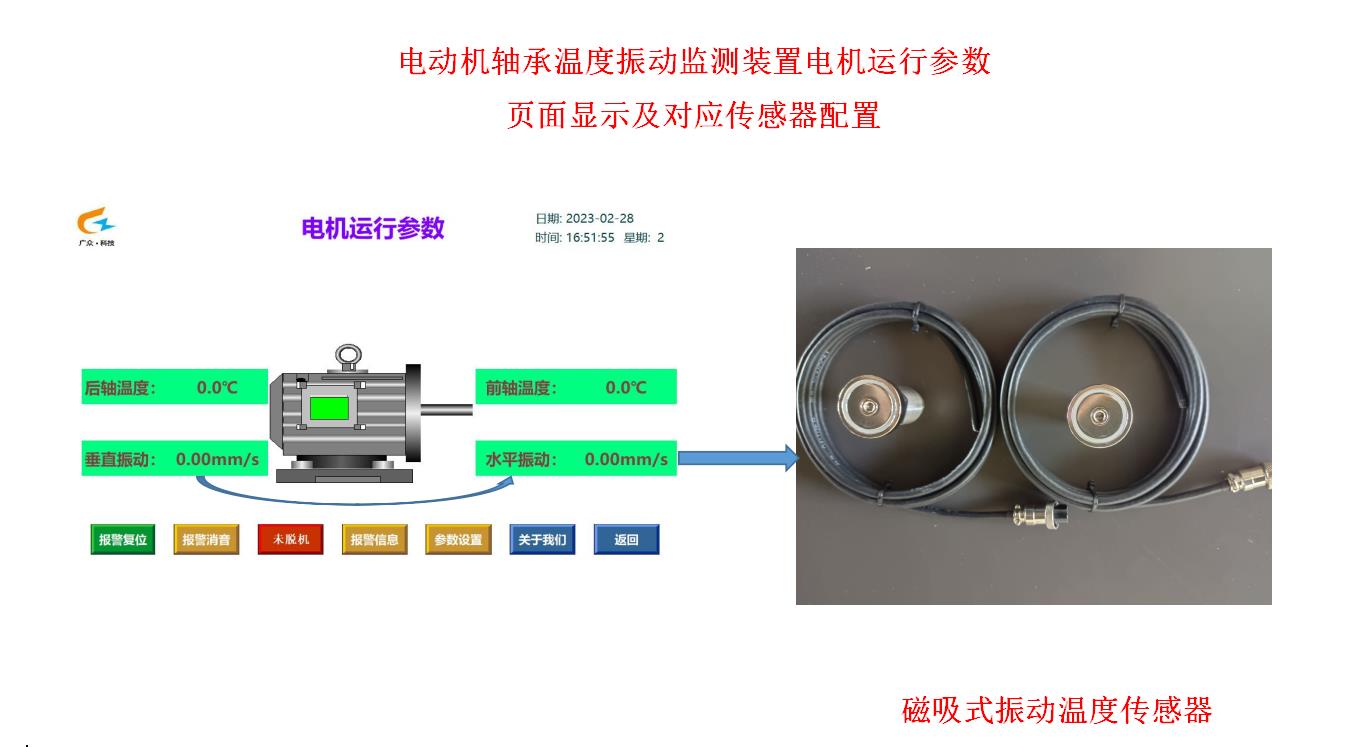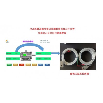 v 前后轴承温度监测:能够通过磁吸式(可选择)温度传感器检测出电机轴承的温度,当监测到的温度超出前期设置值时,监测装置会立即发出停机指令,监测装置自带的声光报警器会进行声光报警提示,监测装置主机会记录发生故障时间方便后期技术人员对数据进行分析(轴承前后各设置一个温度监测点)。