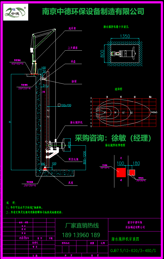 潜水搅拌机的安装系统可在无需排出池中污水的情况下,能快速安装和拆卸潜水搅拌机。潜水搅拌机可在水平面内绕导杆偏转的角度为±60°吊架座、支撑架和下托架与池的联结均采用膨胀螺栓固定,无需预留孔。