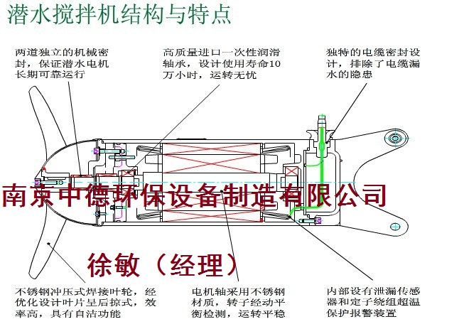 4.潜水搅拌机的电机绕组为F级绝缘,防护等级为IP68,选用一次润滑免维护轴承,具有油室泄漏检测和电机绕组过热保 护功能,使电机的工作更加 可靠。