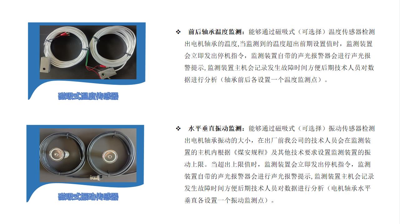 电机监测装置通常由温度监测和振动监测两部分组成。温度监测用于监测电机的温度情况,以防止过热造成电机故障。振动监测用于监测电机的振动情况,以检测可能存在的机械故障或不平衡现象。