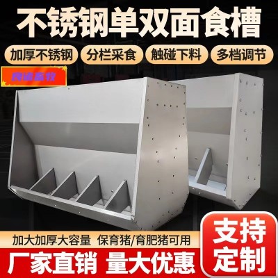 不锈钢食槽适用于干粉料和颗粒料的不限量喂饲。一次投料省时省力,干净卫生,减少肠道。不锈钢猪食槽多种规格可供选择,饲养人员可以根据自己猪只的需求与实际情况加以挑选或是进行定制,从而达到的效果,以提升养殖场的整体效益。而它方便简单的安装操作,也在很大程度上避免了无端损坏问题的出现。