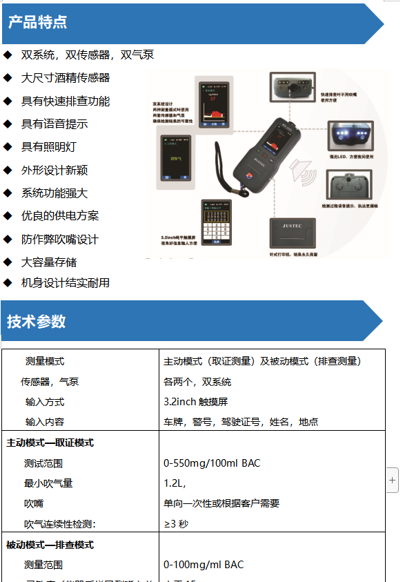 1. 测量模式:主动吹气模式—**用,连续被动模式—排查用,双系统设计,两种测量模式时使用,两套传感器和气泵确保检测结果的可靠性