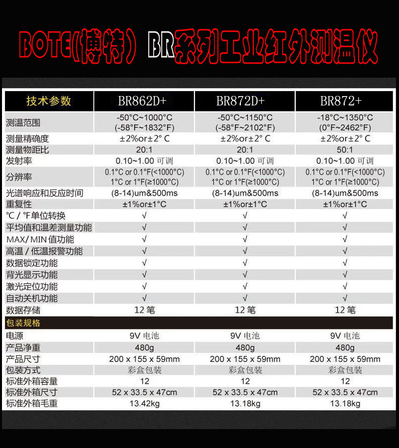 BOTE(博特)BR862D+工业红外测温仪-50-1000℃BR872D+(-50-1150℃) BR872+(-18-1350℃) BOTE(博特)BR862D+工业红外测温仪-50-1000℃BR872D+(-50-1150℃) BR872+(-18-1350℃)