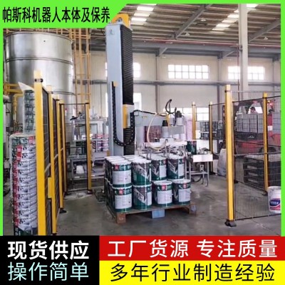 油漆铁桶码垛机器人是将油桶按排列码放在托盘上,进行自动堆码,可堆码多层,然后推出,便于继续进行下一步包装或者叉车运至仓库储存。油漆铁桶码垛机器人实现智能化操作管理,可大大地减少劳动人员和降低劳动强度。