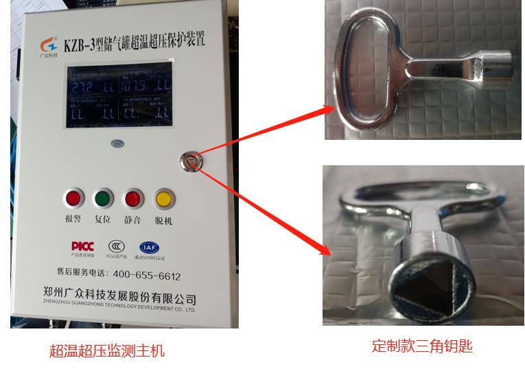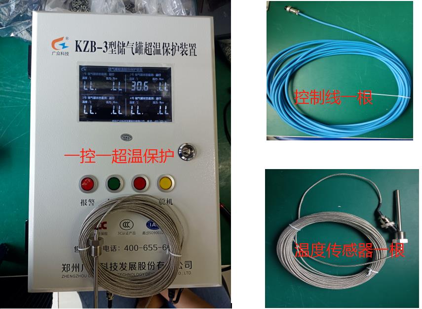 KZB-3该装置能及时监测到空压机储气罐内的温度变化,能实时准确的进行安全监控,该装置可直观准确数显温度并在温度超过预设温度时、可声光报警。可将空压机储气罐的温度有效的控制在120度以下,当温度过高无法控制时会下达停止工作指令使空压机停止运转。