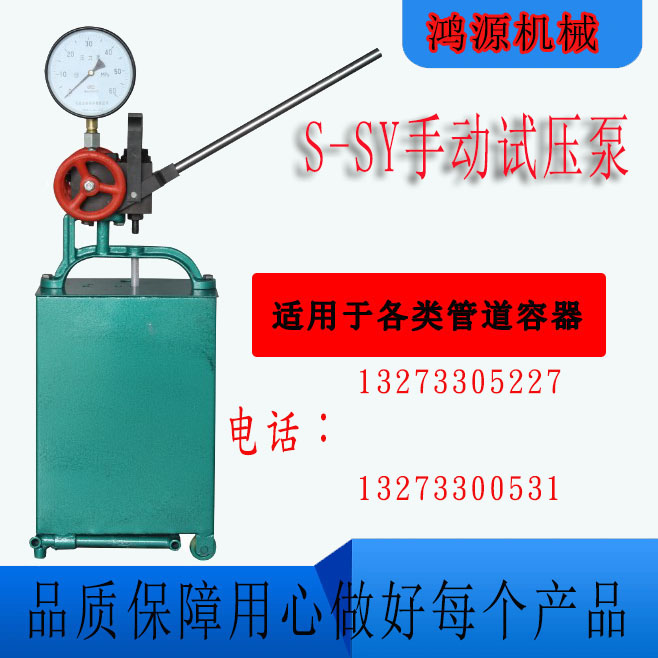手动试压泵是试验各种受压容器和受压设备、管道、阀门、橡胶管件及为其他受压装置进行受压,是测定受压容器设备的测试仪器,高工作压力可达80兆帕(800公斤),在80兆帕(800公斤)以内任何阶段的正确压力下试压,从而达到水压或油压试验的效果。