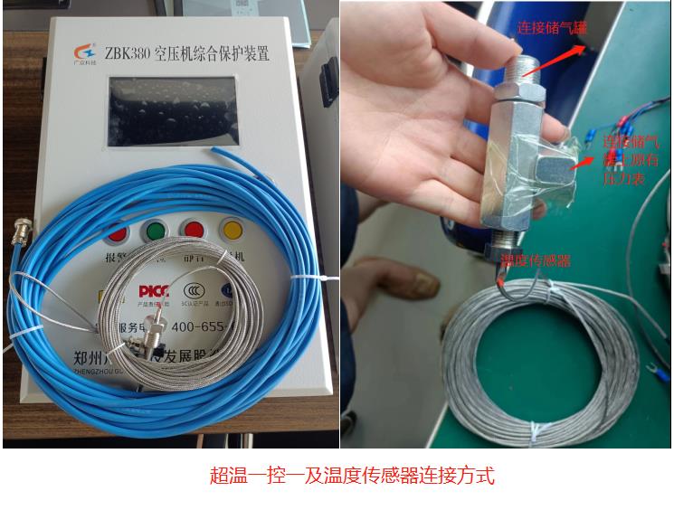 (二)将储气罐保护装置传感器与其所配套装置链接在一起, 在将储气罐(风包)上面的压力表取下,安装在所配三通的压力表接口上,随后把整套的三通外螺纹端旋转连接在储气罐上面的元压力接口处(住:温度传感器的安装必须要配带O型垫圈,防止漏气,压力表的安装即整套三通与储气罐(风包)的连接必须用生胶带做好防漏气处理。)