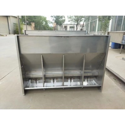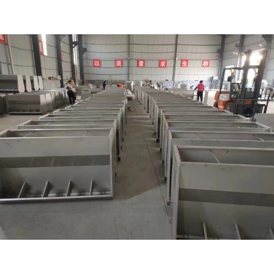 育肥双面槽分为育肥大单面箱和大双面箱,小猪双面中箱,仔猪单面小箱,母猪槽。一个双面能喂二十头以上,单面十头以上。一次投料一百斤可喂1--3天,省时省力,增重快。干净卫生,减少肠道疾病。猪始终保持八分饱,处在生长 状态。
