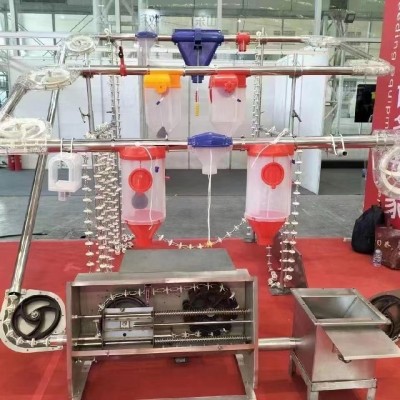 ③母猪用喂料系统是为定位栏设计的,其工作原理是从料线管道挂到定量杯,当到了喂猪的时间,电机拉动钢丝绳,钢丝绳带动定量杯里面的防漏料球上升,定量杯里面饲料落入食槽里。电机反转的装态可以使定量杯里面的求下落达到原来状态,防止漏料。