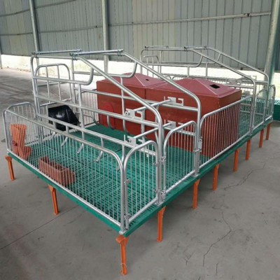 母猪产床,主体采用热浸锌管或喷漆管焊接,使其结构 合理,经济实惠,质量和寿命大幅提高,成为各大规模化养猪厂的 ,仔猪塑料地板,母猪球墨铸铁地板,扁钢大梁支撑。含母猪食槽,仔猪圆形补料槽,保温箱,电热板。