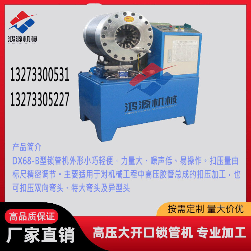 DX68-B型锁管机外形小巧轻便,力量大、噪声低、易操作。扣压量由标尺精密调节。主要适用于对机械工程中高压胶管总成的扣压加工,也可扣压双向弯头、大弯头及异型头。