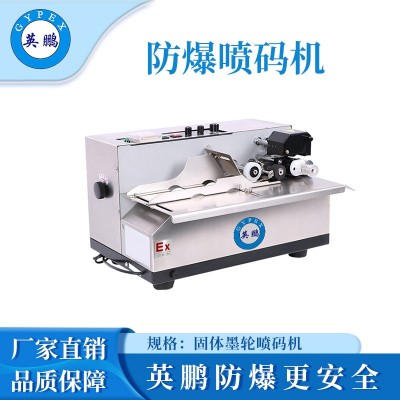 防爆快速固体墨轮印字机采用悬臂轴式、光电控系统及墨轮油系统,保证打印定位精确,字迹清晰、快干、不易探险、且无油墨污染。要适用于医药、食品化妆品、化工、盐业、其他行业对成叠的标签、纸盒、塑料袋、纸、标签纸、铝箔等片状物进行自动分张和打生产日期、有效期、重量、数量、价格、及其他标识内容。